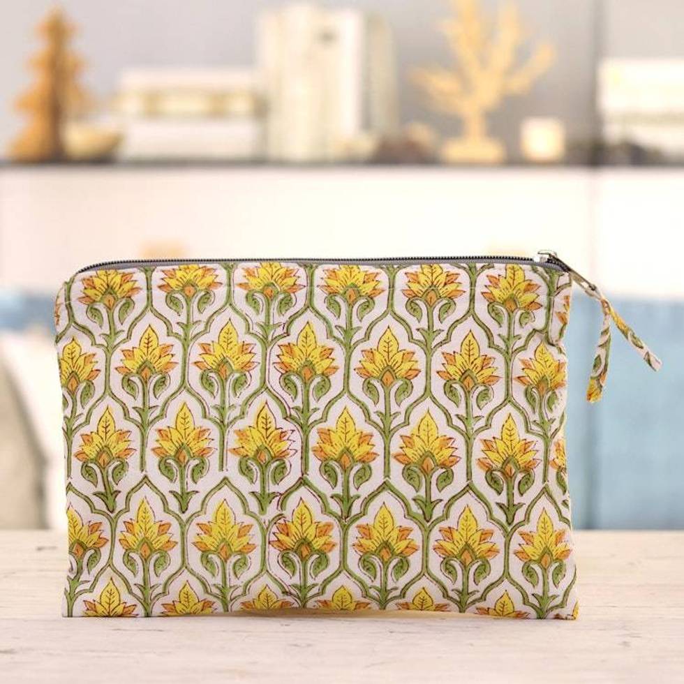 Cotton Cosmetic Bag with Hand-Block Printed Flowers Leaves 'Glorious Buttercup' Item ID: 2676664245