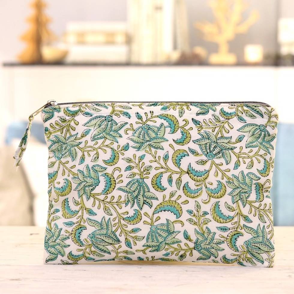 Cotton Cosmetic Bag with Hand-Block Printed Leafs Flowers 'Leafy Friends' Item ID: 2671786570