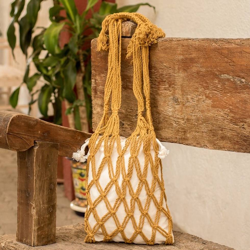 Cotton Macrame Tote Bag in Ivory and Honey from El Salvador 'Happy Day' Item ID: 2671771419