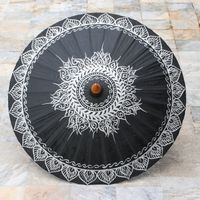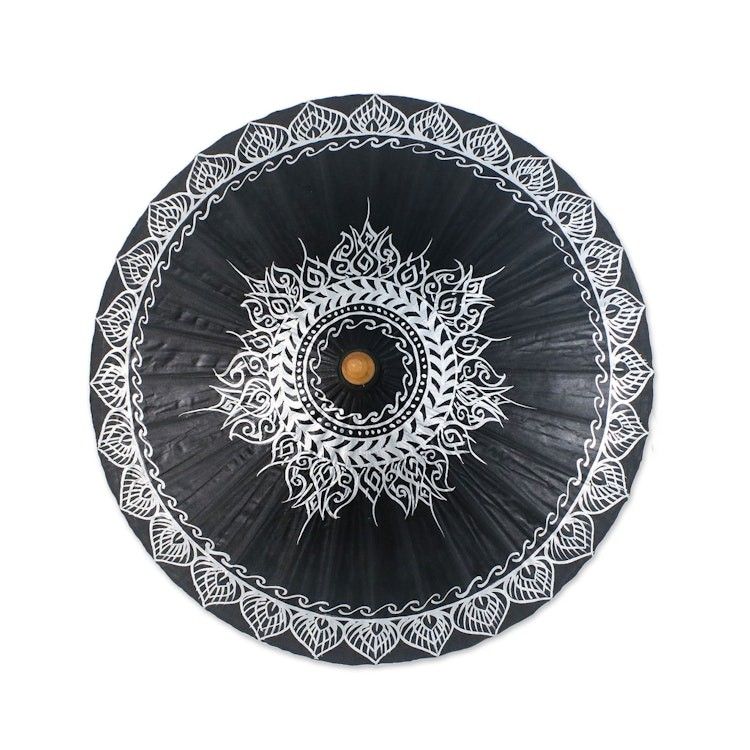 "Perfect for a summer stroll or simply for home decor, this Thai parasol is designed by Nikom. He works with local artisans as he crafts the parasol of cotton fabric with a bamboo frame. The parasol's black top is decorated with intricate, hand-painted motifs in silver."