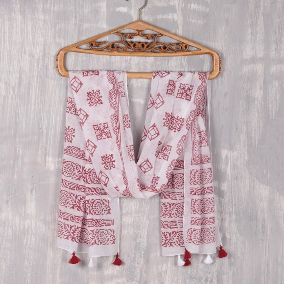 Cotton Scarf with Burgundy Block Print Motifs from India 'Burgundy Bliss' Item ID: 2669924475