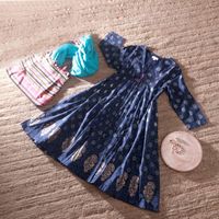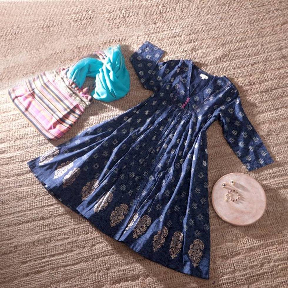 Cotton Tunic Dress with Hand Block-Printed Floral Leaf Theme 'Royal Blue Enchantment' Item ID: 2676664027