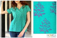 Cotton Tunic Shirt Blue Green Block Print Floral By India 'Mumbai Bouquet' Item ID: 2669892158
