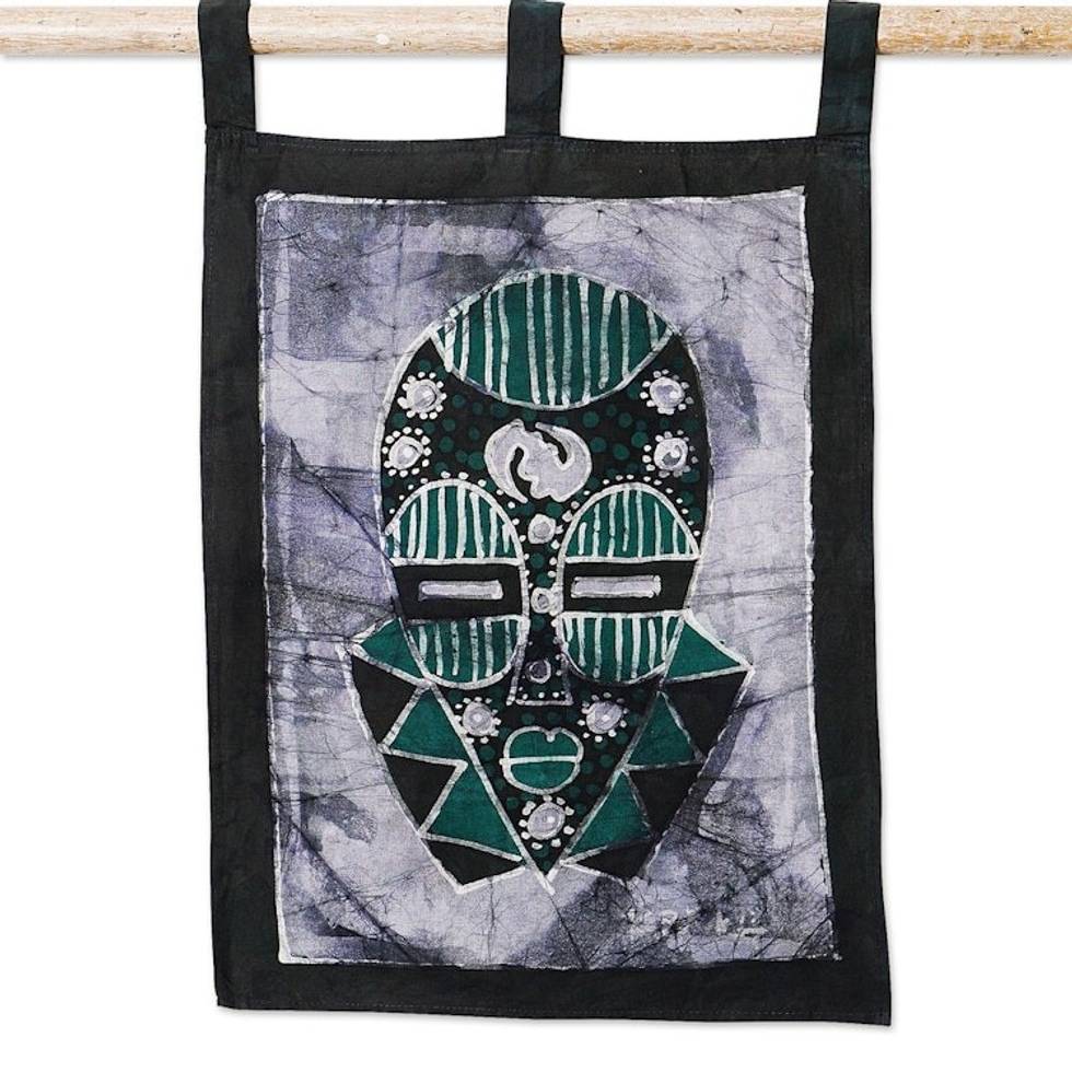 Cotton Wall Hanging of African Mask in a Cool Palette 'Green Silence' Item ID: 2671804178
