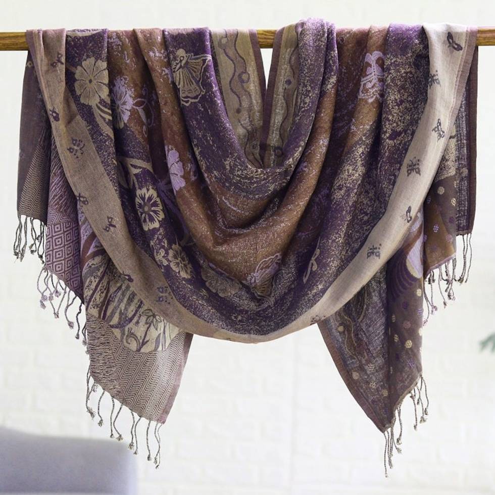 This shawl is beautifully detailed and has wonderful complementary colors. The material is soft and feels good on your skin.