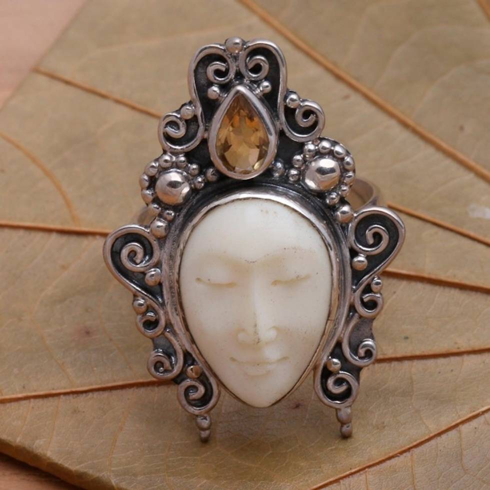 I am so in love with Buana’s Sleeping Princess ring! It is simply beautiful. Her face is carved in the classic angular Bali style and her regal crown is topped with a pretty citrine stone that suits the hue of the bone. I bought another of his rings on QVC and wear them together proudly. Thank you, Buana!