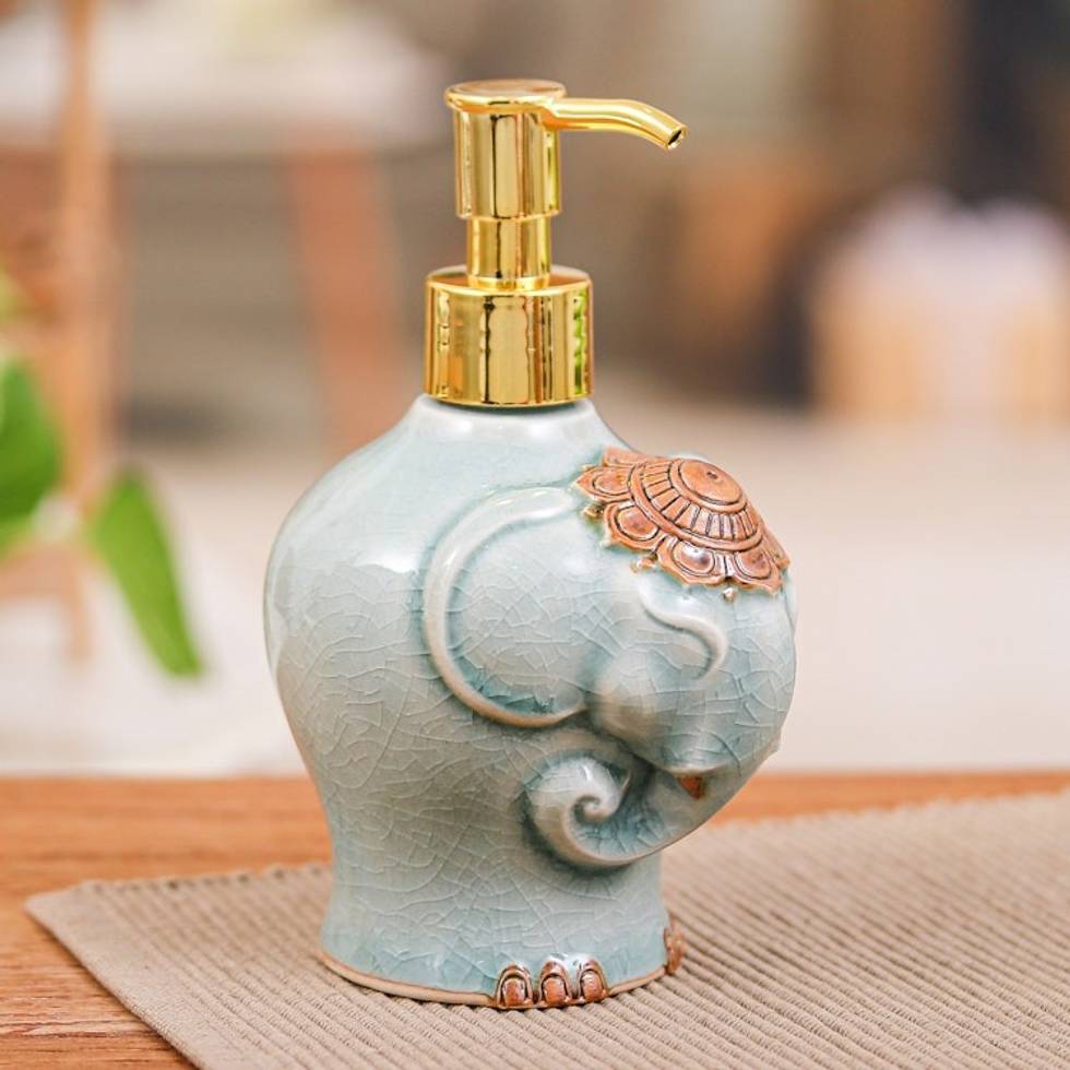 Crackled Celadon Ceramic Elephant Soap Dispenser in Green 'Misty Elephant' Item ID: 2671797093