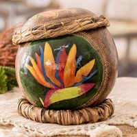 "Symbol of Costa Rica's immortal beauty, the crane flower crowns a creation by artist Ruth Mora, who reunites talent with natural elements to capture the region's tropical aura in one charming decorative accent. The artisan works on a dried gourd to paint this portrait of the country's beauty, combining intense hues with the piece's natural brown hue, all completed with a natural fiber lid."