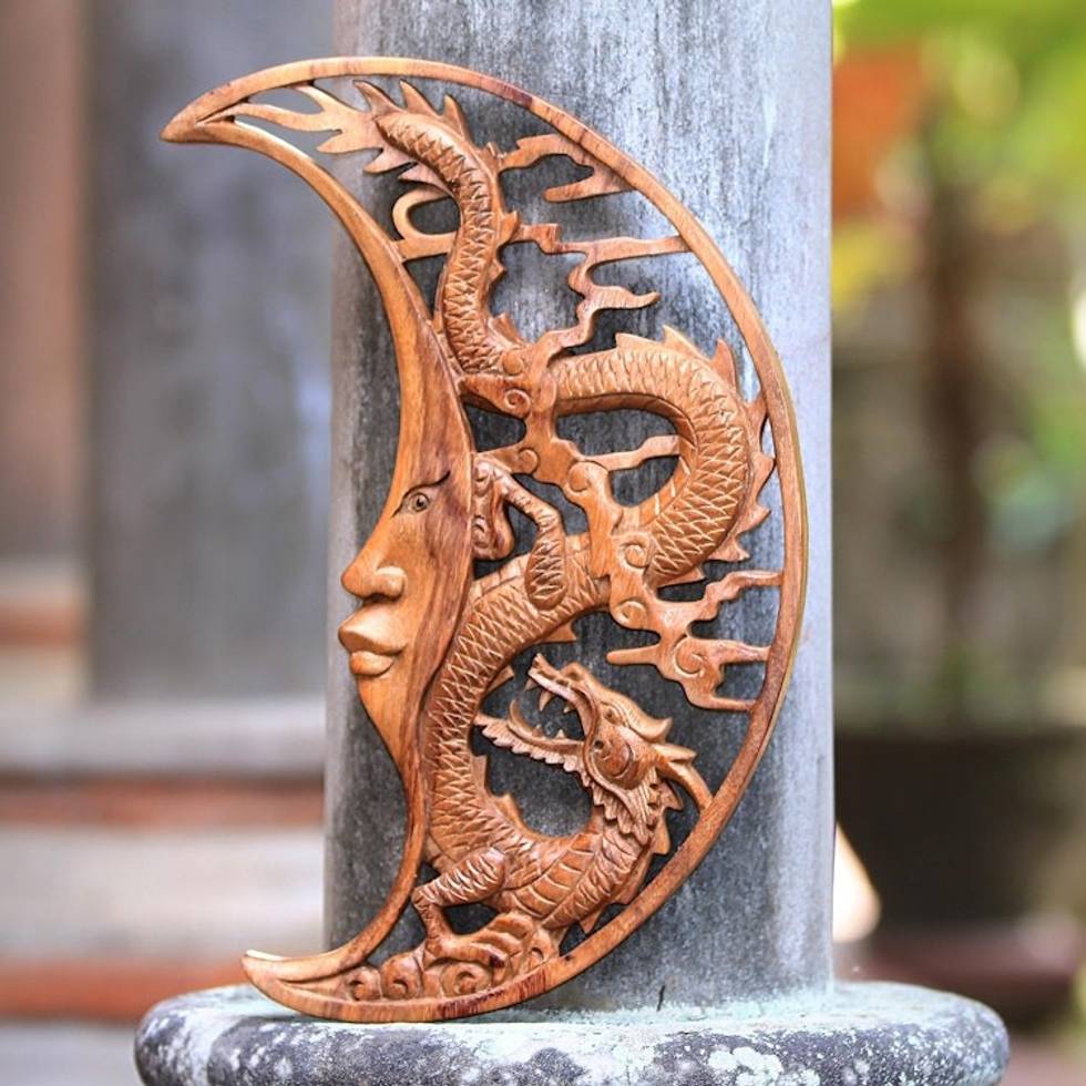 Crescent Moon Dragon Hand Carved Wood Relief Wall Panel 'Crescent Dragon' Item ID: 2671736460