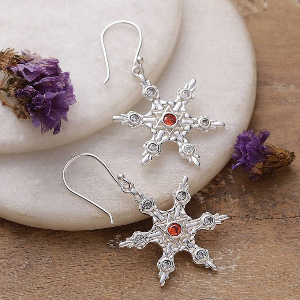 Crimson and White Cubic Zirconia Snowflake Dangle Earrings 'Snowflake Flame' Item ID: 2671781460