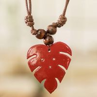 "The vitality and alluring energy of the Costa Rican forests inspire a superb design that captures the essence of the tropical jungle. Artisan Kattia Lopez uses a calabash gourd to create the leaf pendant that beautifies this unique necklace, painting it in an intense crimson hue that symbolizes courage. As a way to enrich the design's natural aura, Kattia adds pinewood beads to the brown cord and finishes the accessory with a comfortable sliding knot that can be adjusted to your liking."