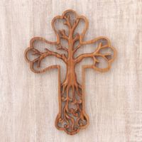 Cross and Tree-Themed Suar Wood Relief Panel from Bali 'Tree Cross' Item ID: 2671476374