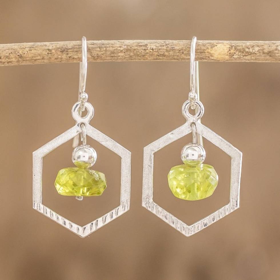 Crystal Beaded Green Sterling Silver Hexagon Dangle Earrings 'Hexagon in Green' Item ID: 2671772050