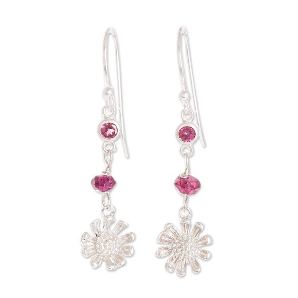 Crystal Beaded Sterling Silver Floral Dangle Earrings 'Burgundy Daisies' Item ID: 2671771993