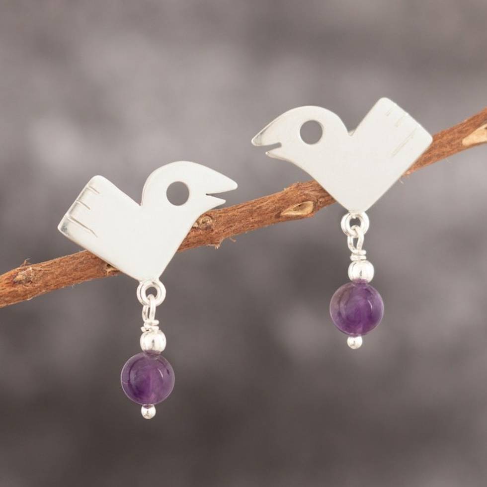 Cultural Sterling Silver Bird Dangle Earrings with Amethyst 'Purple Sican Birds' Item ID: 2671698037