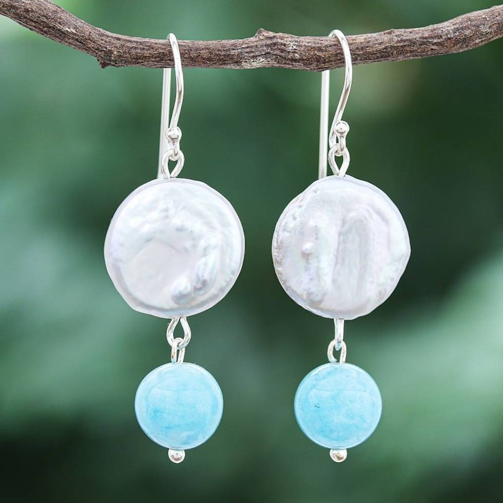 Cultured Freshwater Pearl and Quartz Dangle Earrings 'Blue Candy Sea' Item ID: 2671799916