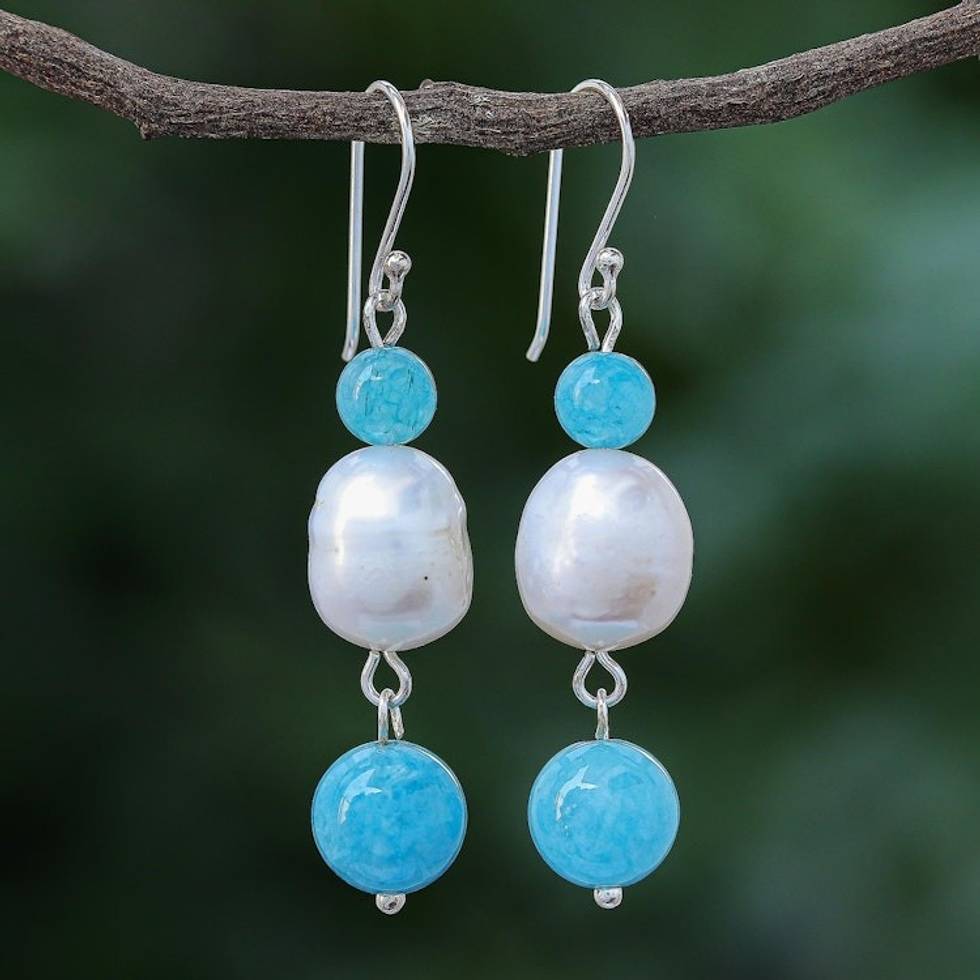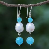 Cultured Freshwater Pearl and Quartz Dangle Earrings 'Electric Ocean' Item ID: 2671800453
