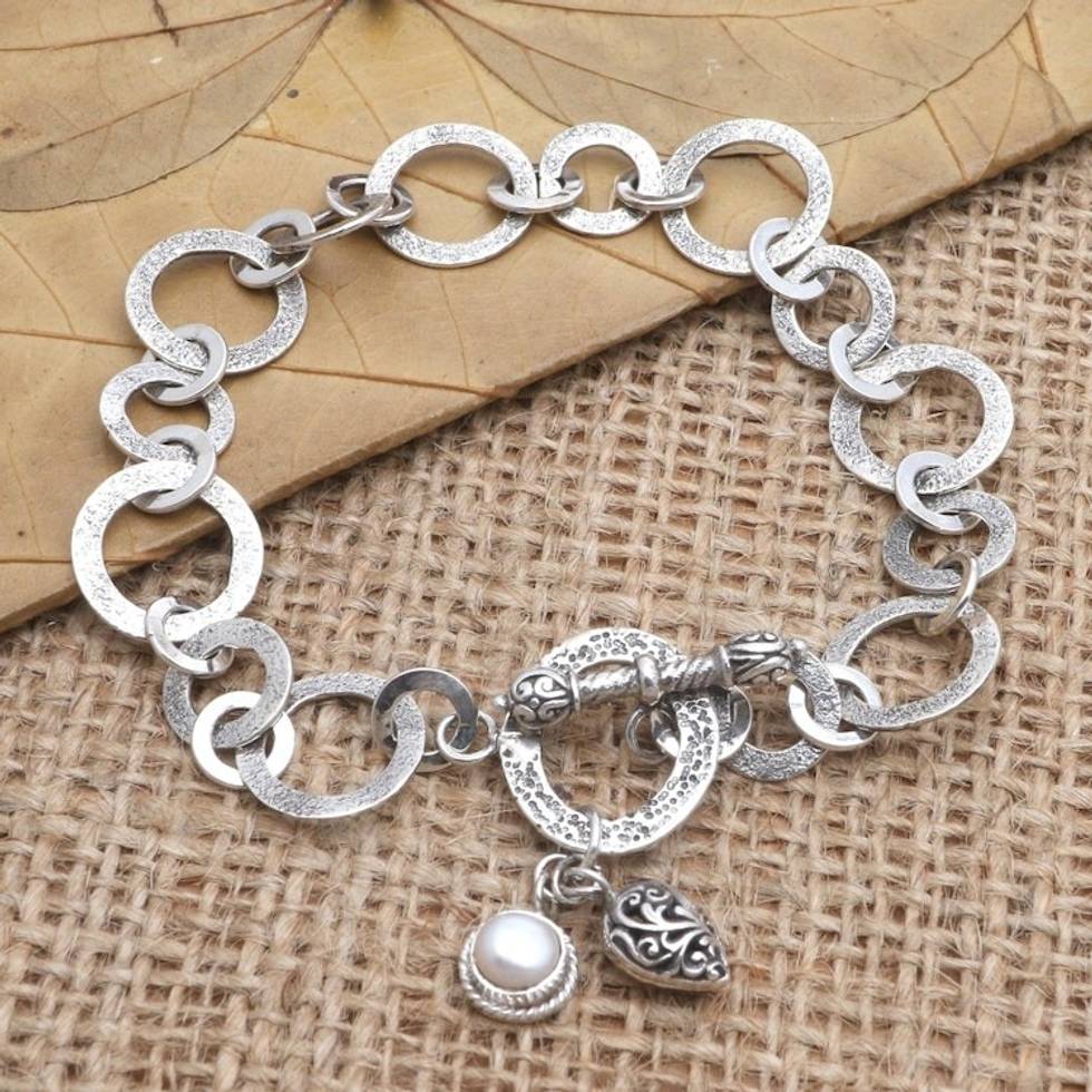 "Linked together, rings of textured silver shimmer on Rosalia Tarigan's pretty charm bracelet. Javanese artisans use a series of sterling silver hoops to hand craft the bracelet, treating the precious metal with a subtle textured finish. Two charms--a cultured freshwater pearl and an engraved sterling silver bauble--dangle from the bracelet's toggle clasp."