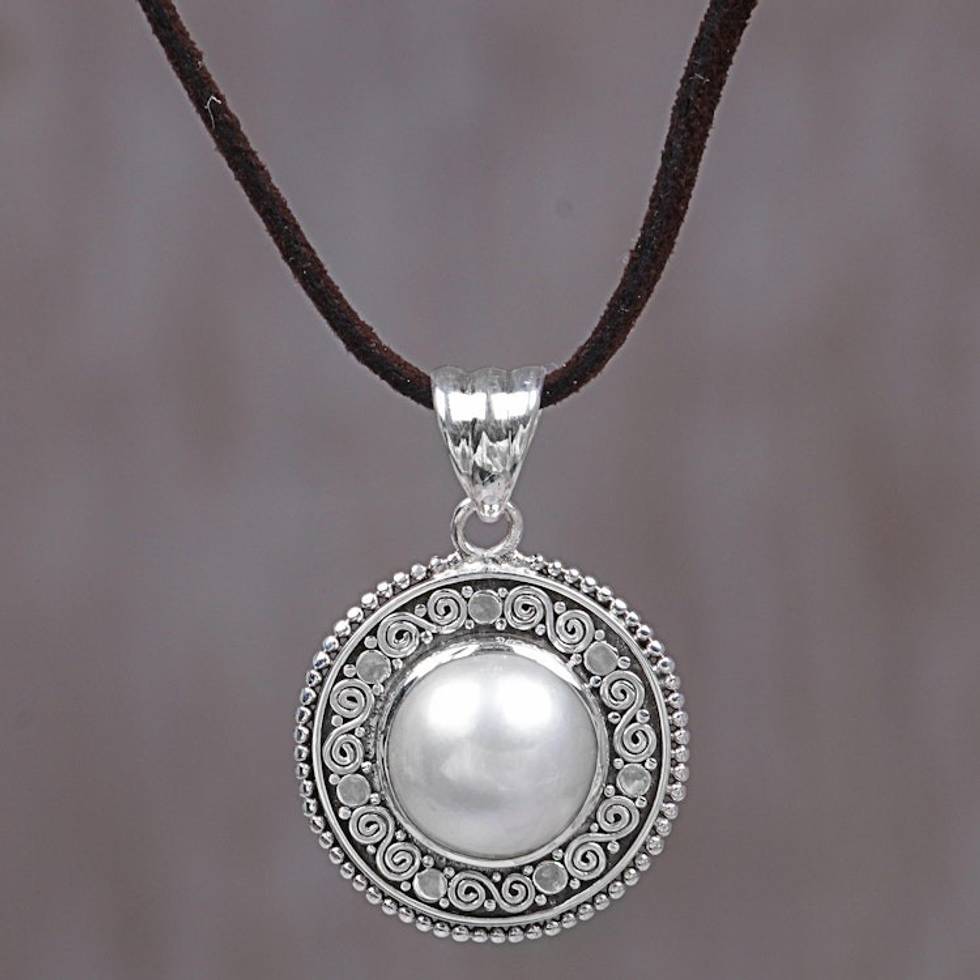 Cultured Mabe Pearl and Leather Cord Pendant Necklace 'White Orb' Item ID: 2669922042