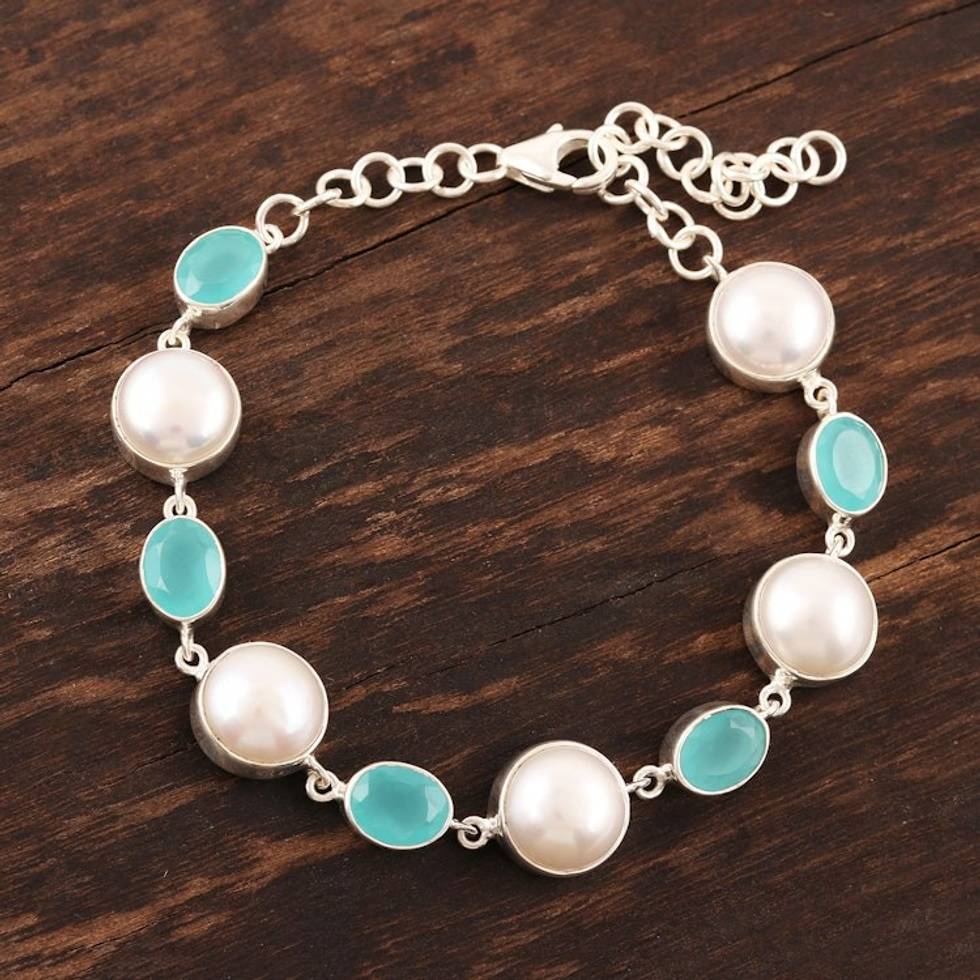 Cultured Pearl and Blue Chalcedony Link Bracelet from India 'Gleam and Glow' Item ID: 2671789681