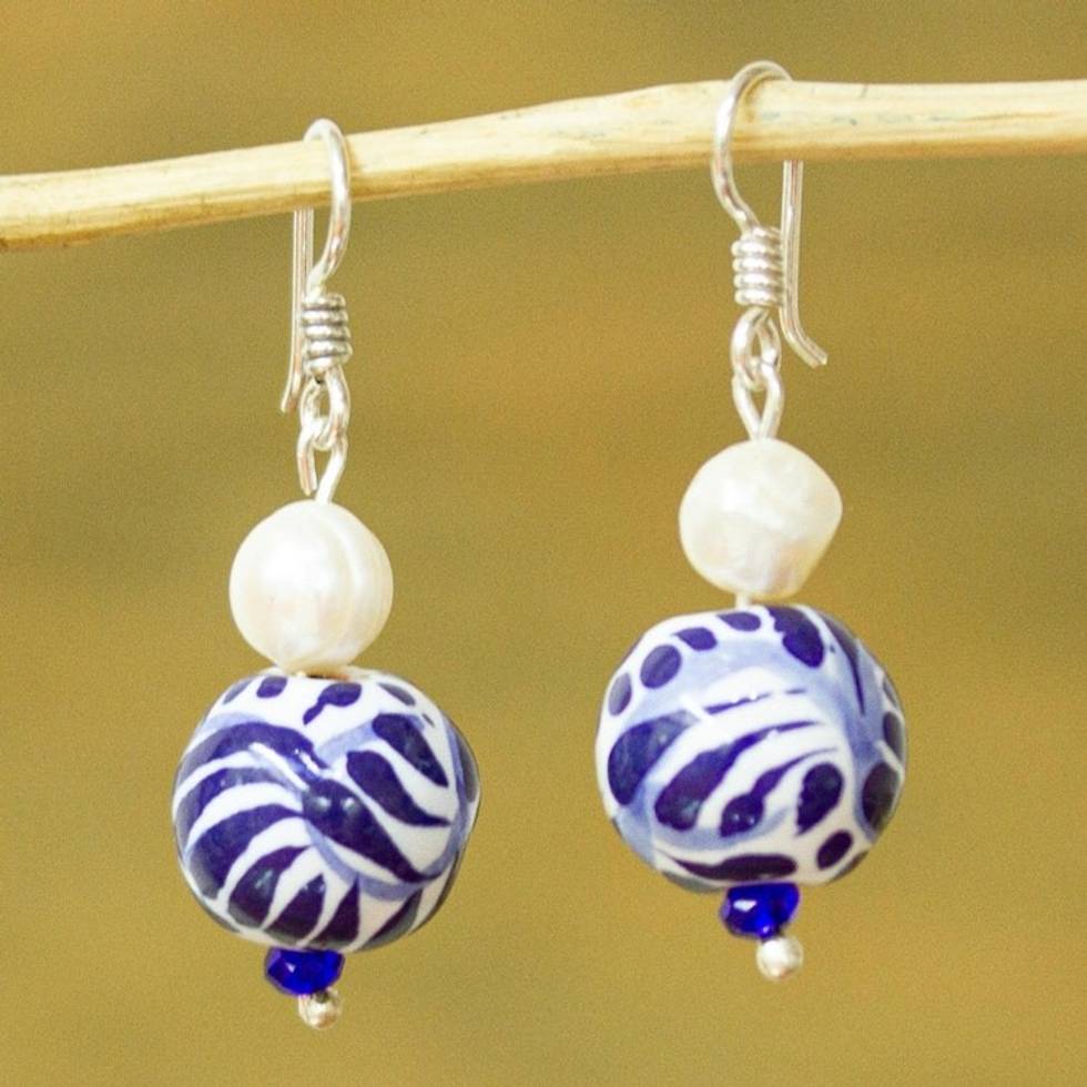 Cultured Pearl and Ceramic Puebla-Style Bead Dangle Earrings 'Indigo Bloom' Item ID: 2671808843