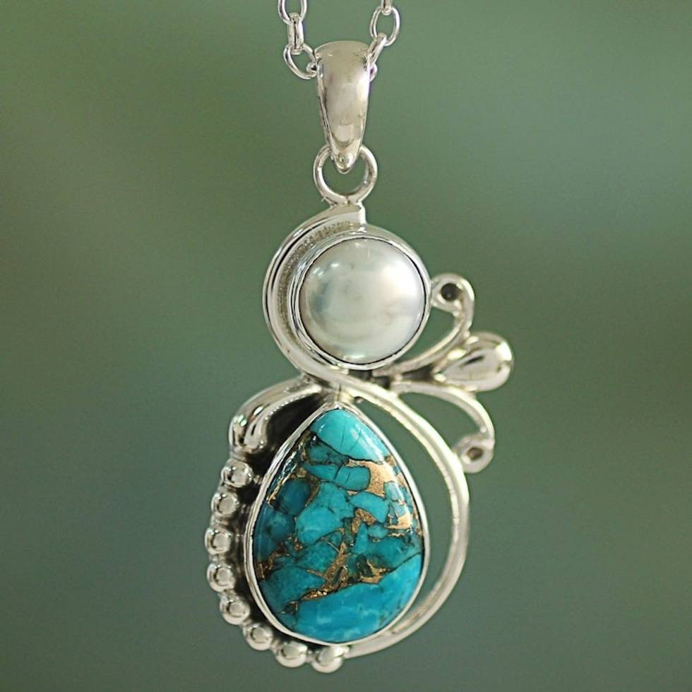Cultured Pearl and Composite Turquoise Silver 925 Necklace 'Joyous Blue Sky' Item ID: 2671793014