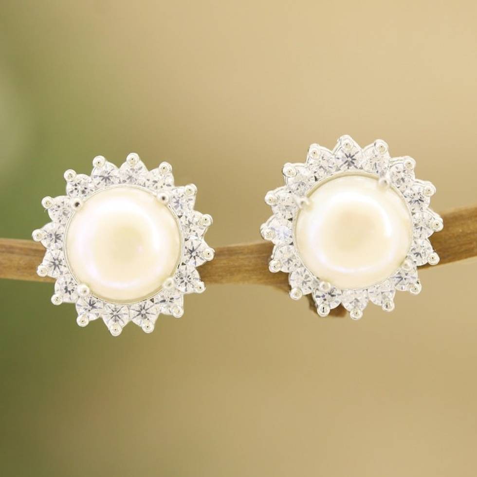 Cultured Pearl and Cubic Zirconia Button Earrings from India 'Floral Glow' Item ID: 2671788526