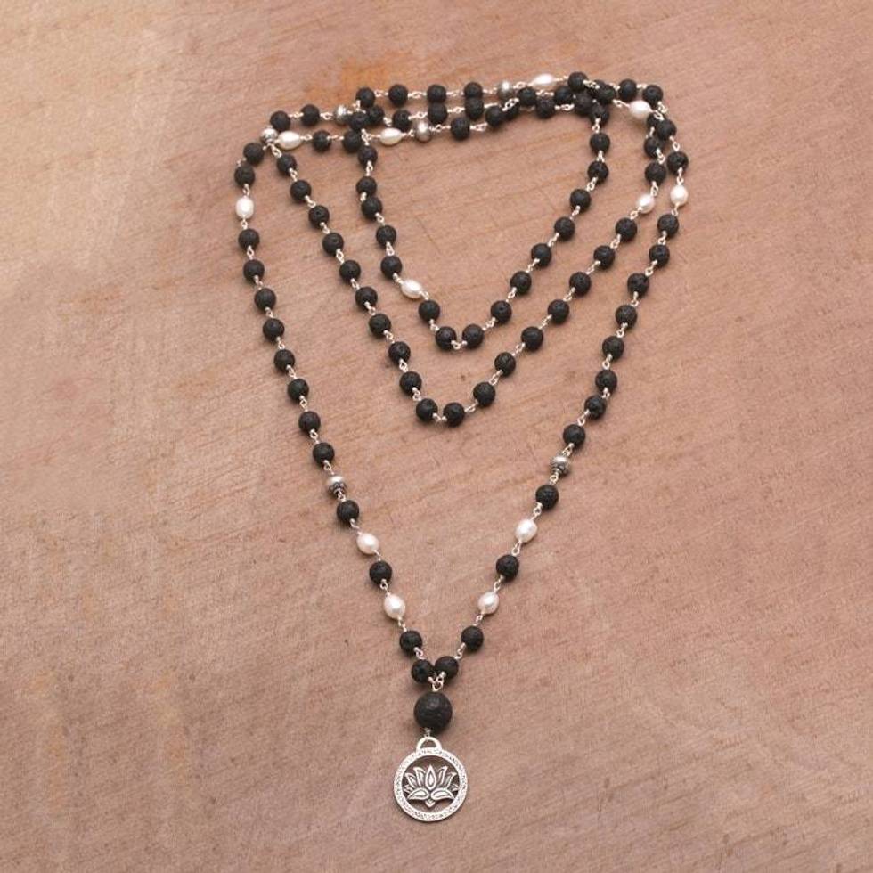 Cultured Pearl and Lava Stone Pendant Necklace from Bali 'Lotus Power' Item ID: 2676662787