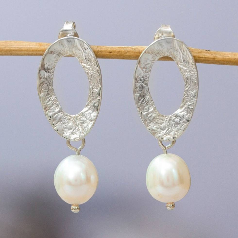Cultured Pearl and Matte Sterling Silver Dangle Earrings 'Cycle of Pearls' Item ID: 2671639340
