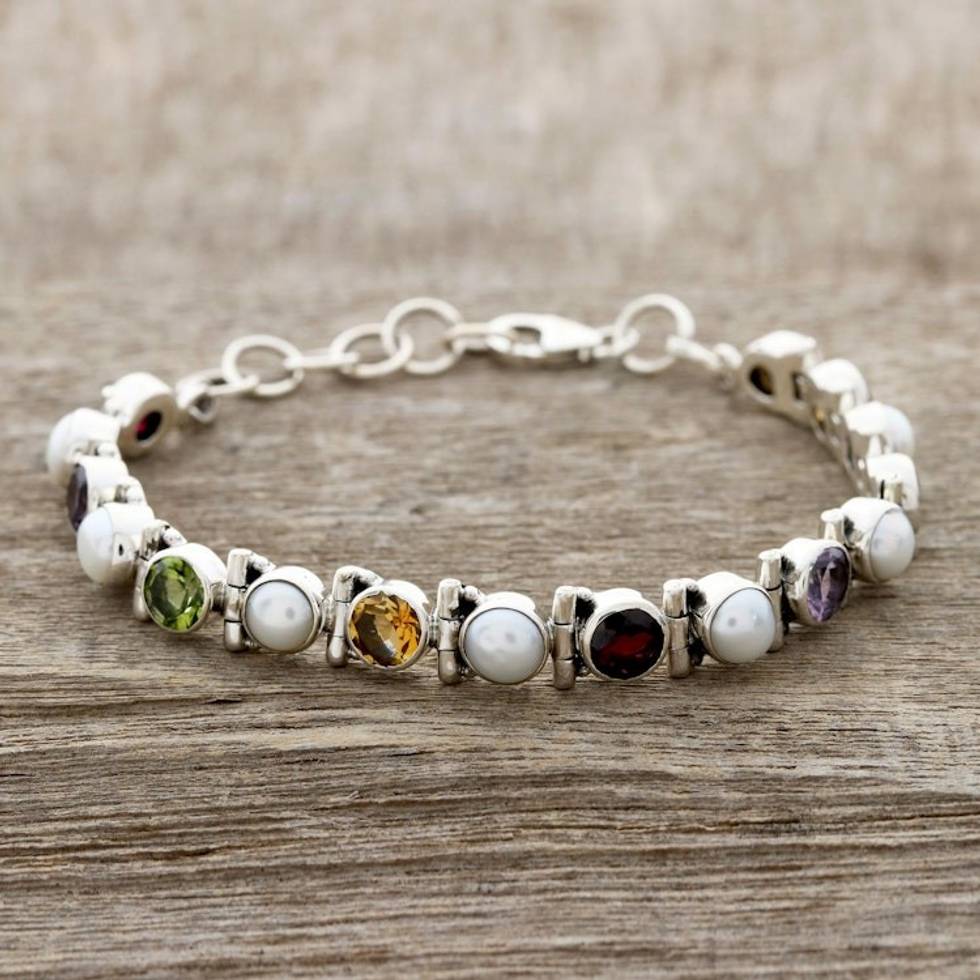 Cultured Pearl and Multi-Gem Tennis Bracelet from India 'Sparkling Grace' Item ID: 2669924423