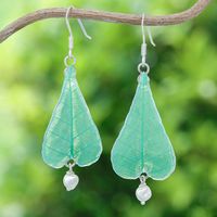 Cultured Pearl and Natural Leaf Dangle Earrings in Green 'Green Heart of Nature' Item ID: 2669926537