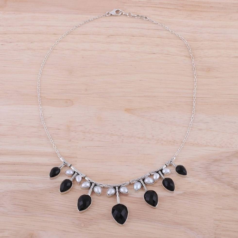 Cultured Pearl and Onyx Sterling Silver Waterfall Necklace 'Monochrome Bouquet' Item ID: 2671791041