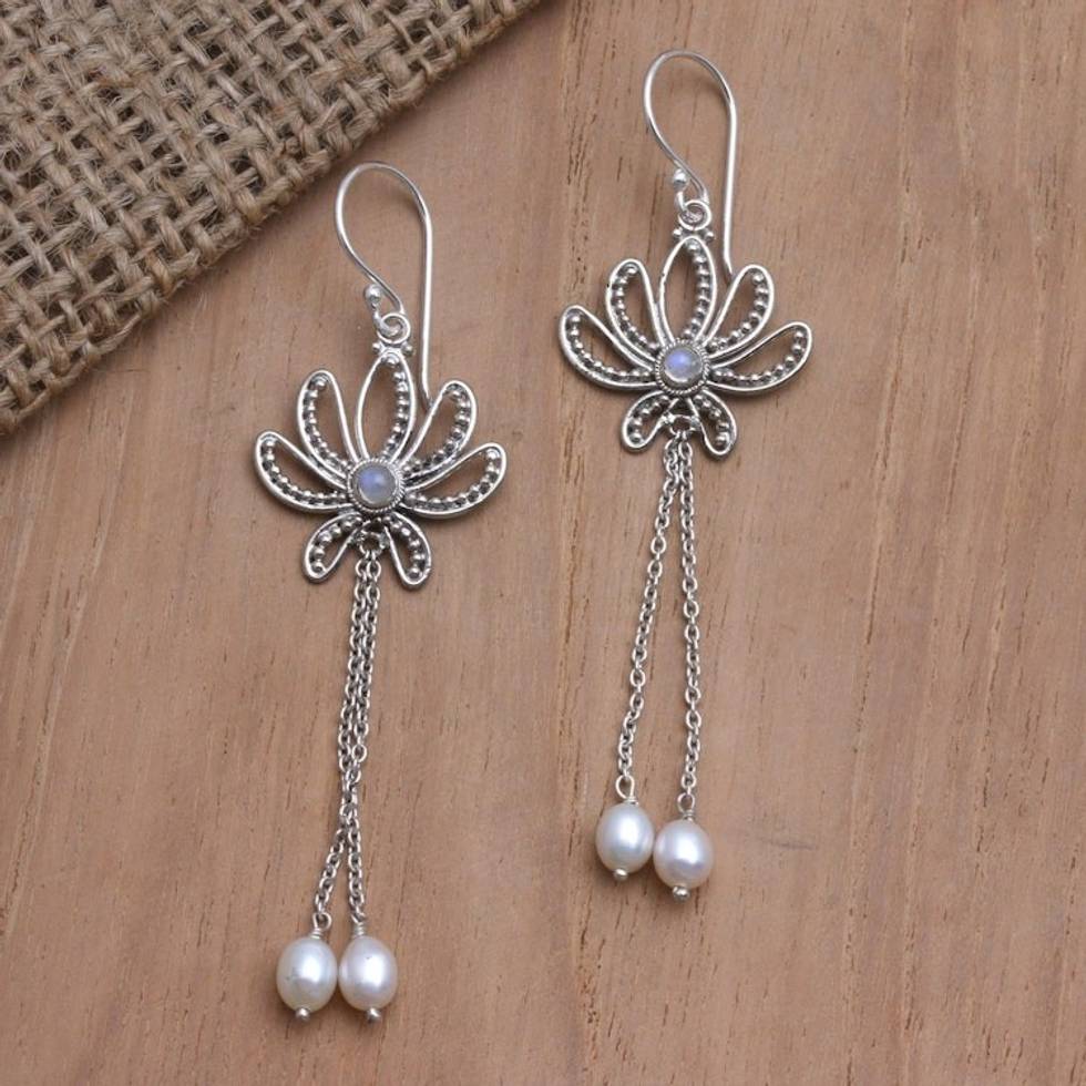 Cultured Pearl and Rainbow Moonstone Dangle Earrings 'Winking Lotus' Item ID: 2671747785