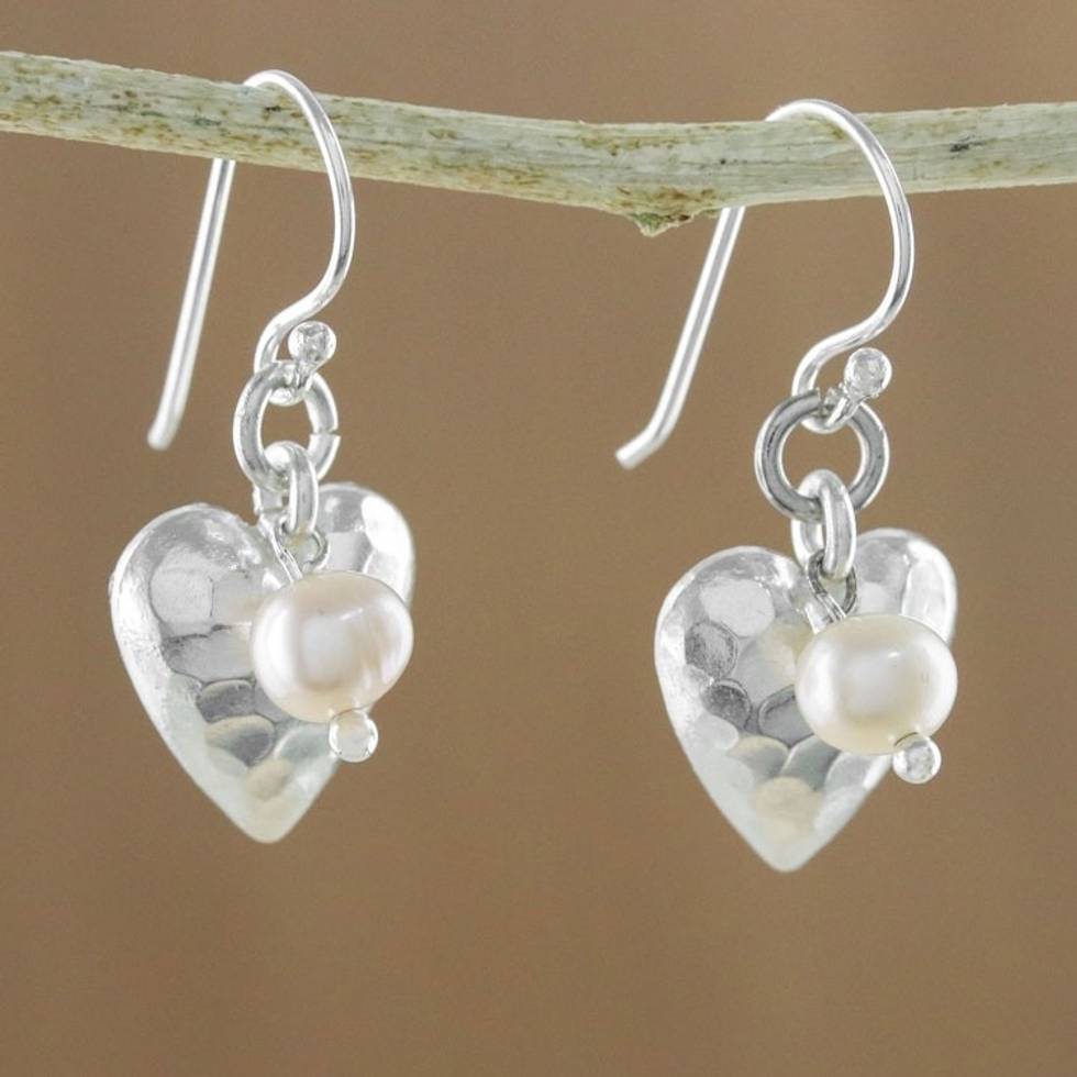 Cultured Pearl and Silver Heart Earrings from Thailand 'Fabulous Hearts' Item ID: 2671799435