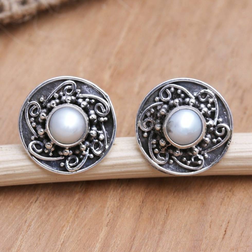 Cultured Pearl and Sterling Silver Button Earrings 'Love Goes On in White' Item ID: 2671747302