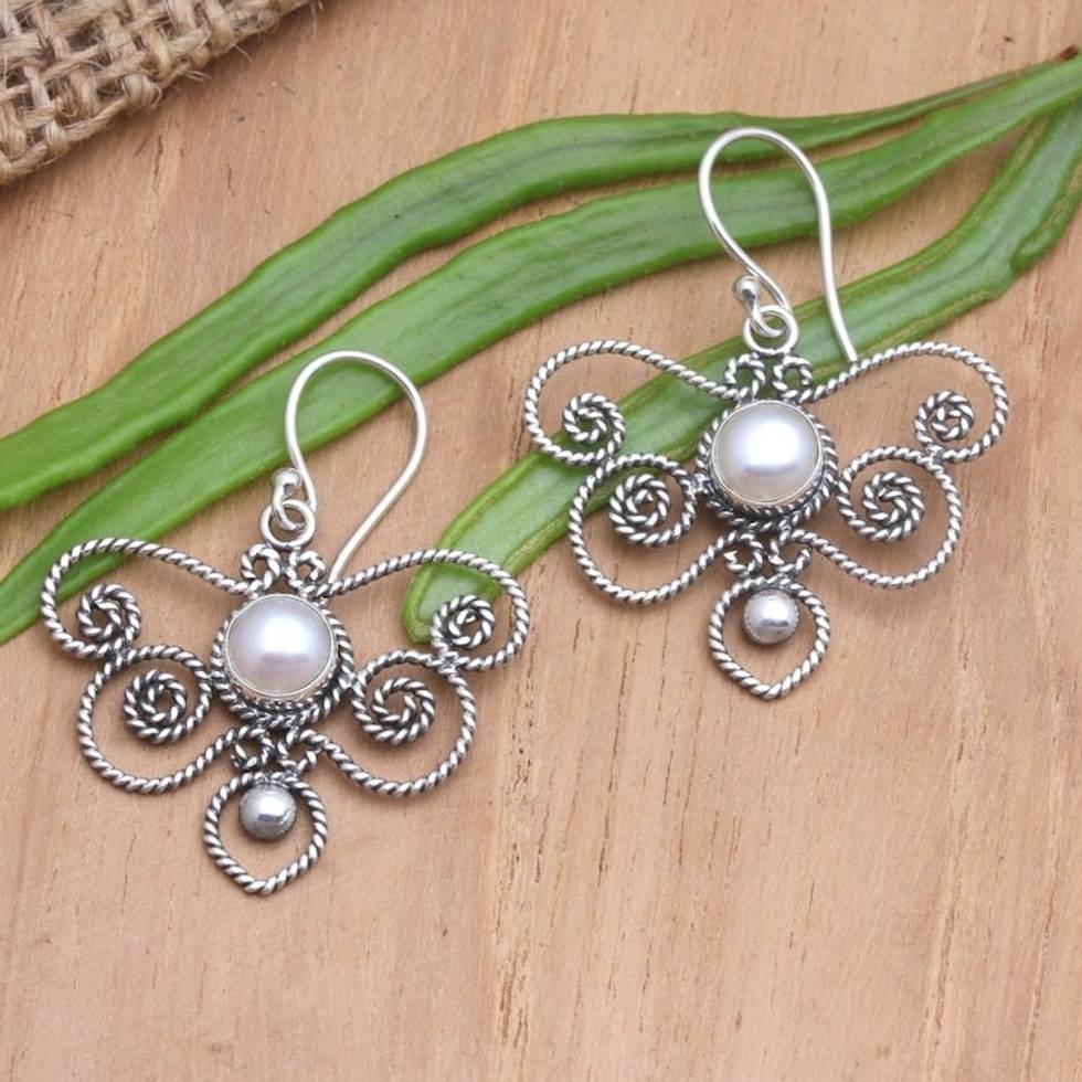 Cultured Pearl and Sterling Silver Dangle Earrings 'Butterfly Twist' Item ID: 2671747388