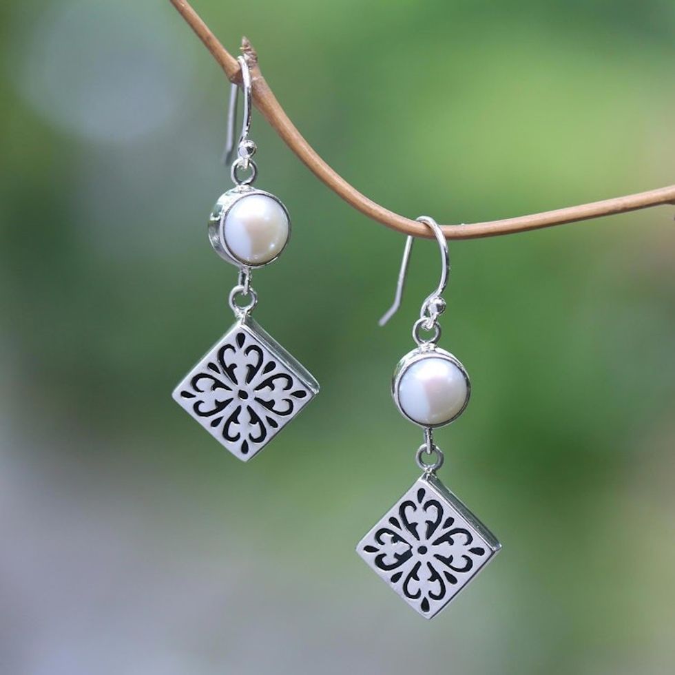 Cultured Pearl and Sterling Silver Dangle Earrings from Bali 'Square Dance' Item ID: 2669887300