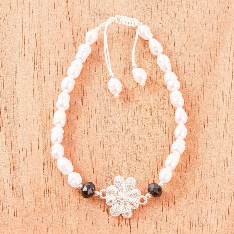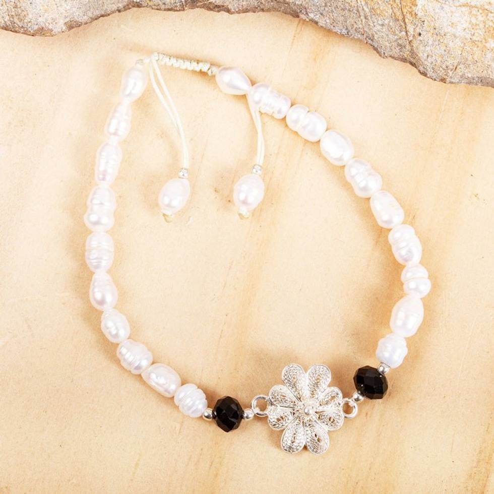 Cultured Pearl and Sterling Silver Filigree Flower Bracelet 'River Flower' Item ID: 2671808306