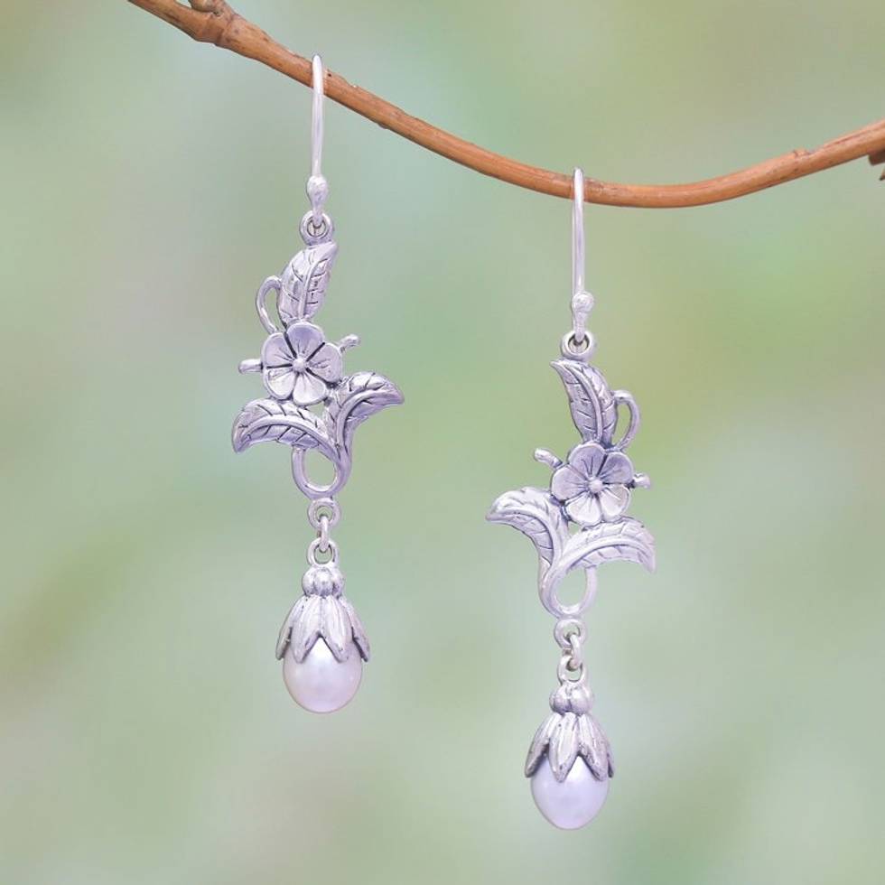 Cultured Pearl and Sterling Silver Flower Dangle Earrings 'Delicate Blooms' Item ID: 2671736465
