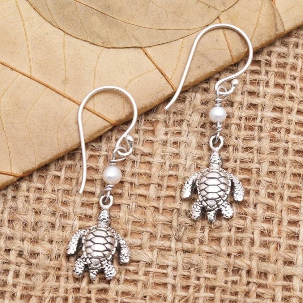Cultured Pearl and Sterling Silver Turtle Earrings 'Swimming Sea Turtle' Item ID: 2671745316