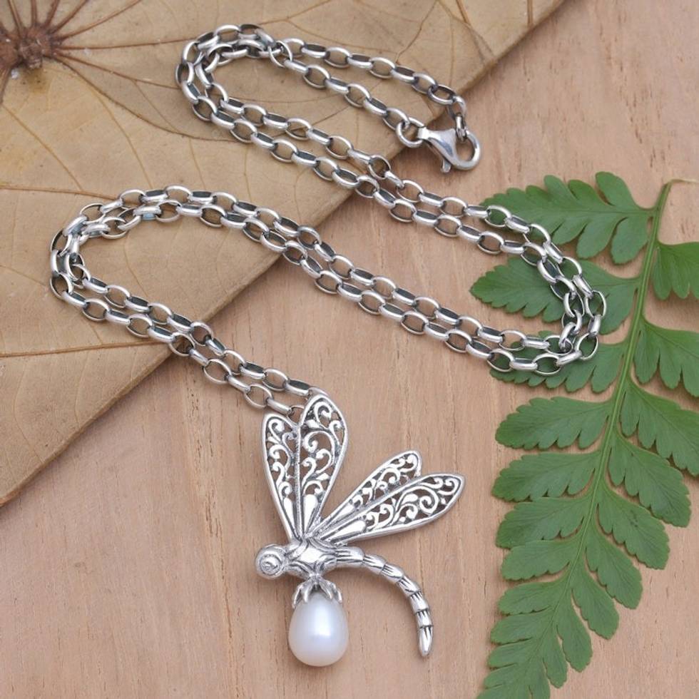 Cultured Pearl Dragonfly Pendant Necklace 'Dragonfly's Lantern' Item ID: 2671747654