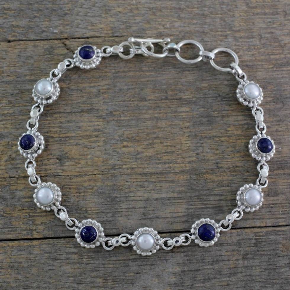 Cultured Pearl Floral Bracelet in Silver with Lapis Lazuli 'Petite Flowers' Item ID: 2669924219