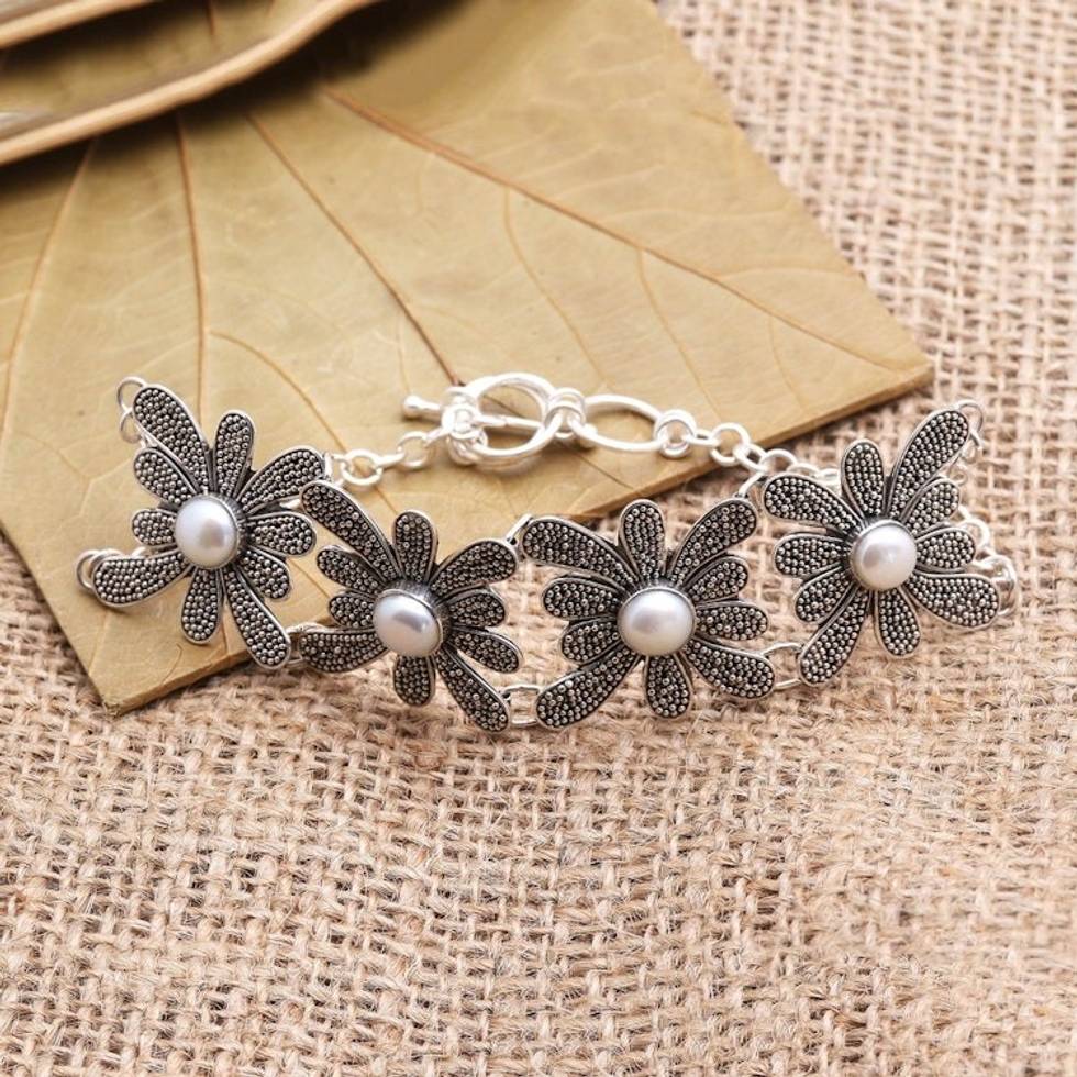 Cultured Pearl Flower Link Bracelet from Bali 'Jawan Blossom' Item ID: 2671737133
