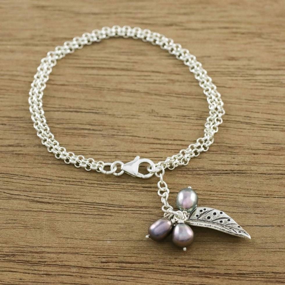 Cultured Pearl Leaf Bracelet in Grey from Thailand 'Lively Leaf in Grey' Item ID: 2671801494