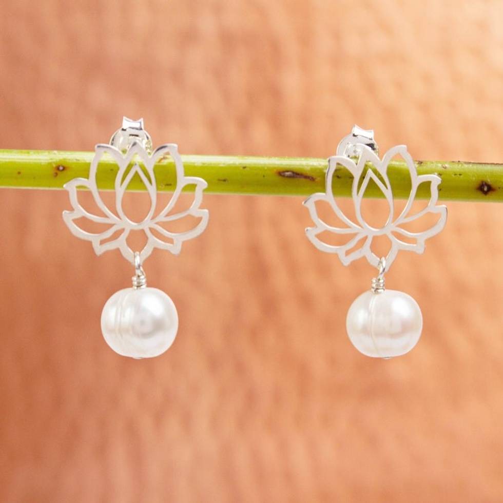 Cultured Pearl Lotus Flower Dangle Earrings from Mexico 'Glowing Lotus Charm' Item ID: 2669932189