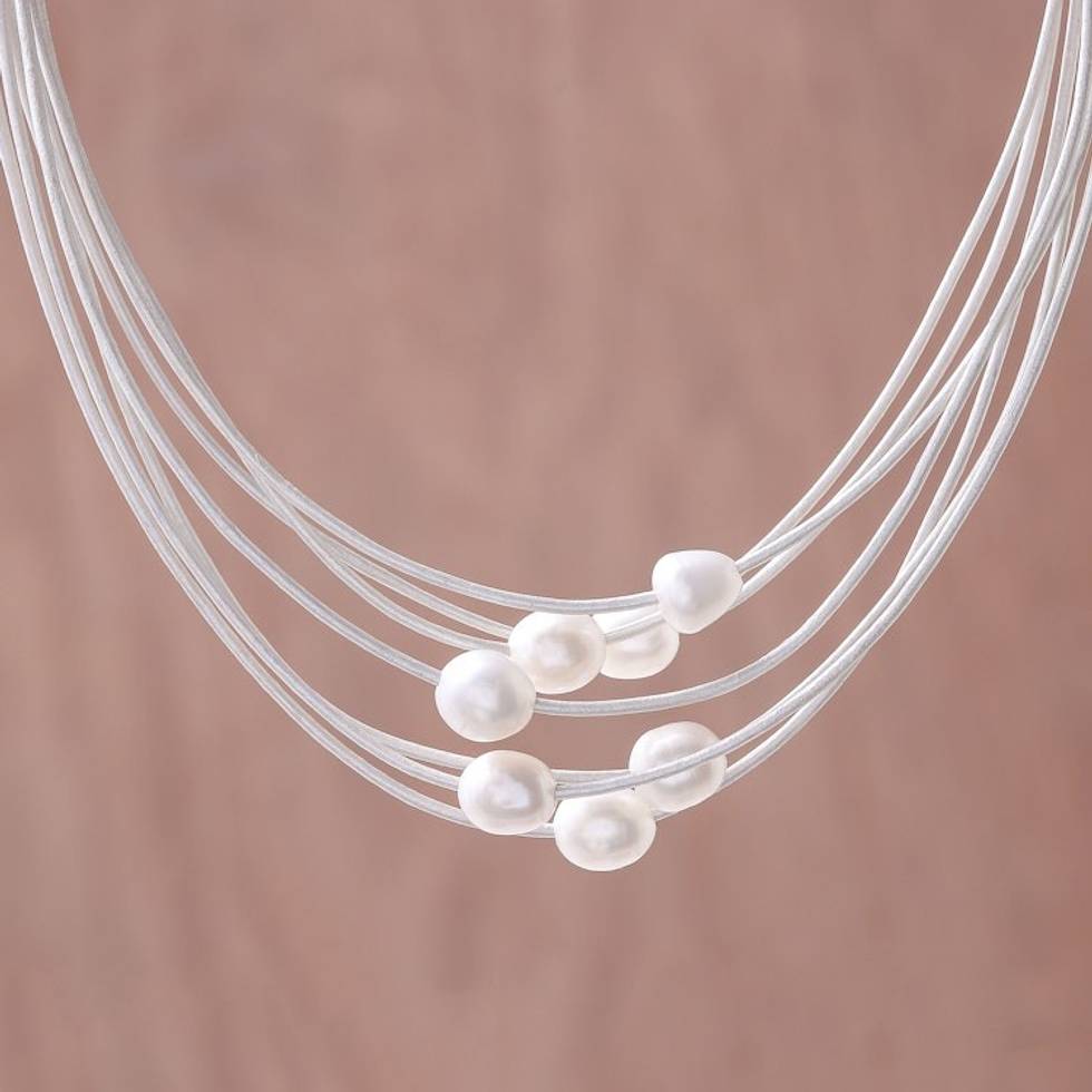 Cultured Pearl Pendant Necklace on White Cord from Thailand 'Luminous Pebbles in White' Item ID: 2669927590