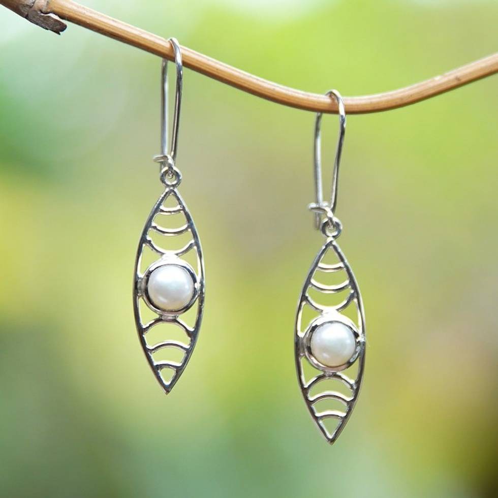 "Discover the essence of contemporary sophistication with these dangle earrings crafted in Bali and inspired by the distinctive shape of surfboards. Fashioned from lustrous sterling silver, Artisan Sunarto's sleek design showcases elaborate openwork details and sublime white cultured pearls, each with a delicate rose overtone. Make a bold and chic statement with this exquisite addition to your jewelry repertoire."