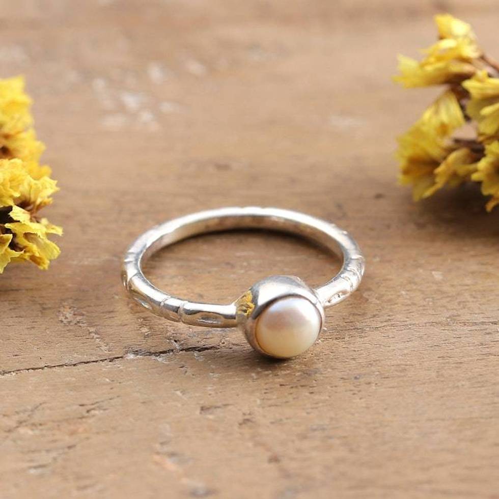 Cultured Pearl Silver Solitaire Ring with Textured Band 'Luminous Moon' Item ID: 2676665776