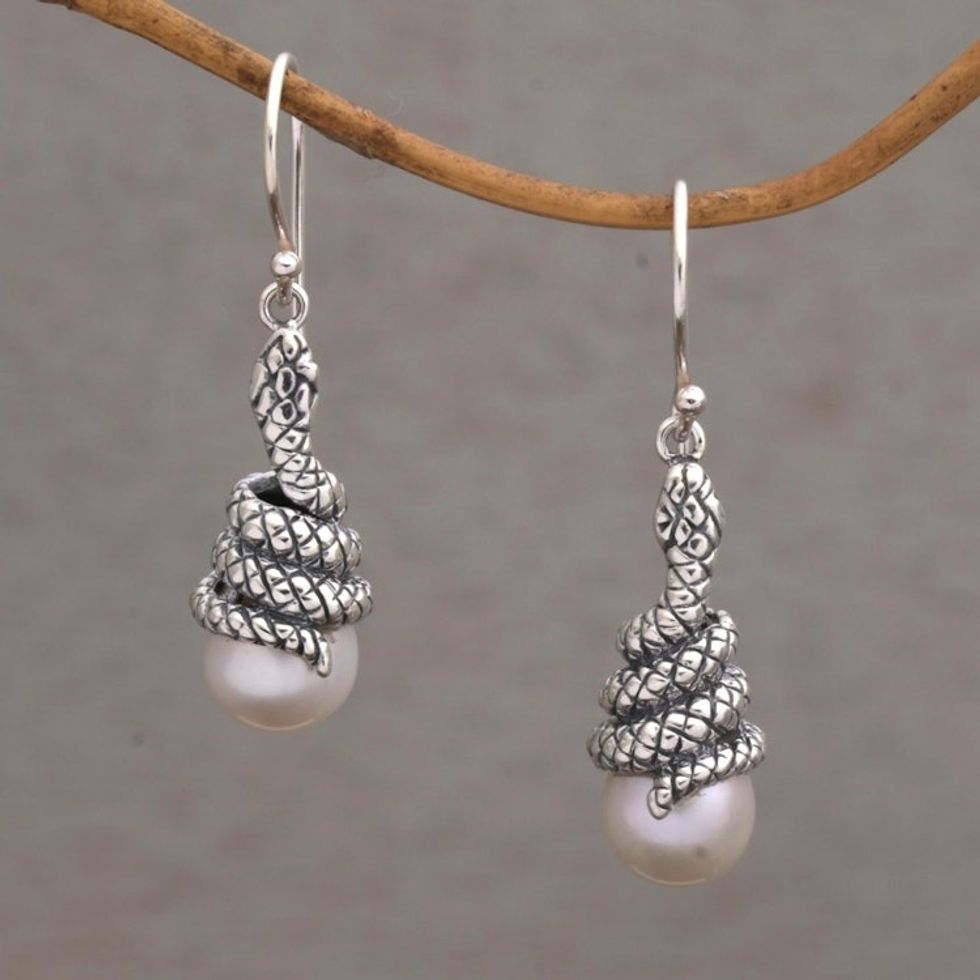 Cultured Pearl Snake Dangle Earrings from Bali 'Snake Guardians' Item ID: 2671479454