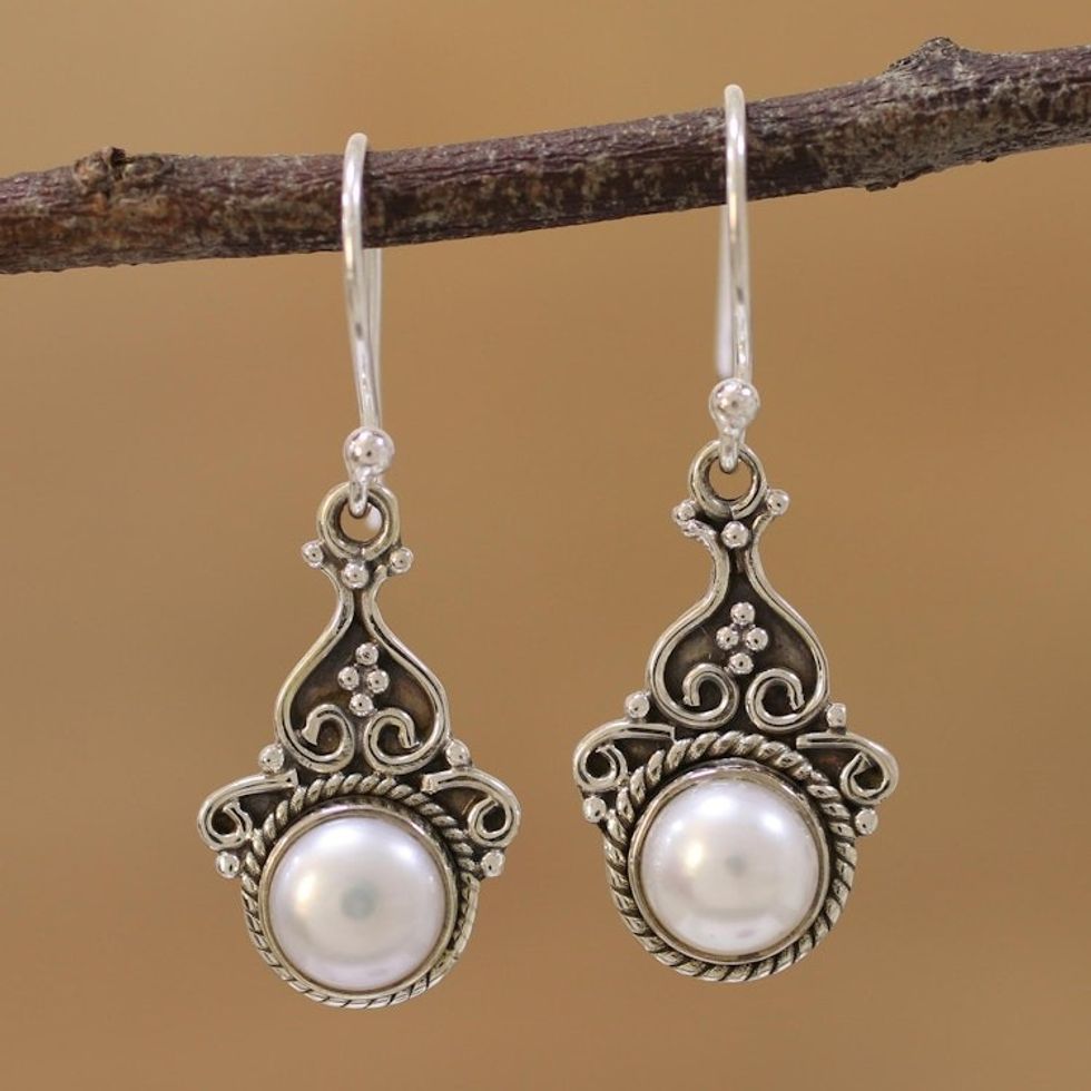 Cultured Pearl Sterling Silver Dangle Earrings from India 'Crowned Charm' Item ID: 2671791334
